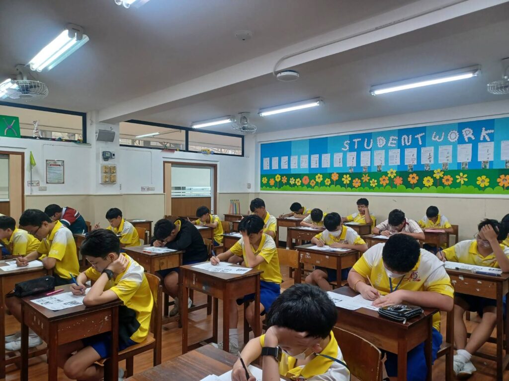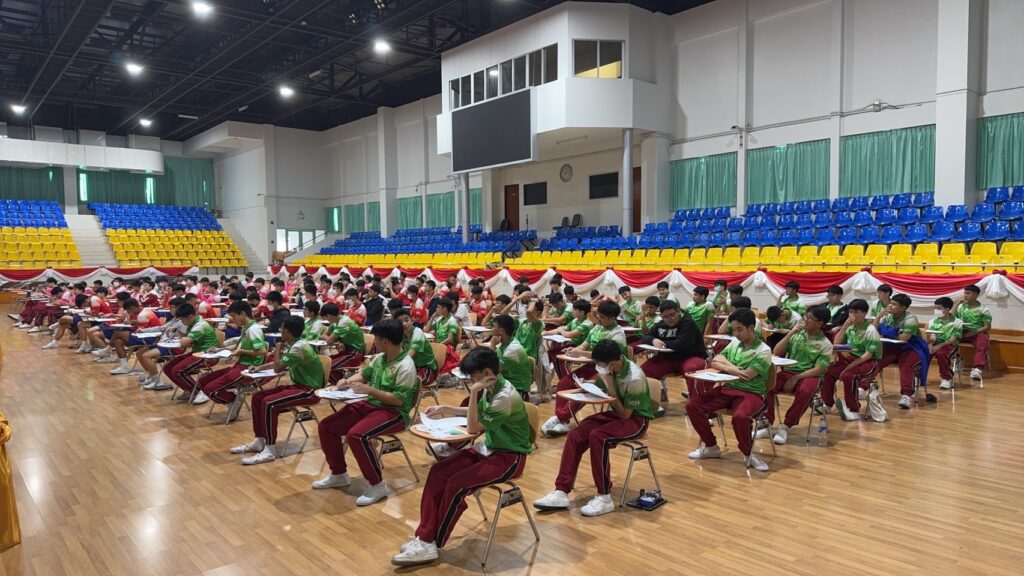 ระหว่างการสอบนักเรียนทุกคนตั้งใจทำแบบทดสอบด้วยความเงียบสงบ บางคนใช้สมาธิอย่างเต็มที่ในการฟังเสียงสนทนา บางคนกำลังอ่านบทความภาษาอังกฤษอย่างตั้งอกตั้งใจ บรรยากาศนอกห้องสอบ เต็มไปด้วยความตื่นเต้นและการให้กำลังใจจากคุณครูและเพื่อนๆ ซึ่งช่วยให้นักเรียนรู้สึกผ่อนคลายมากขึ้นก่อนเข้าสอบ