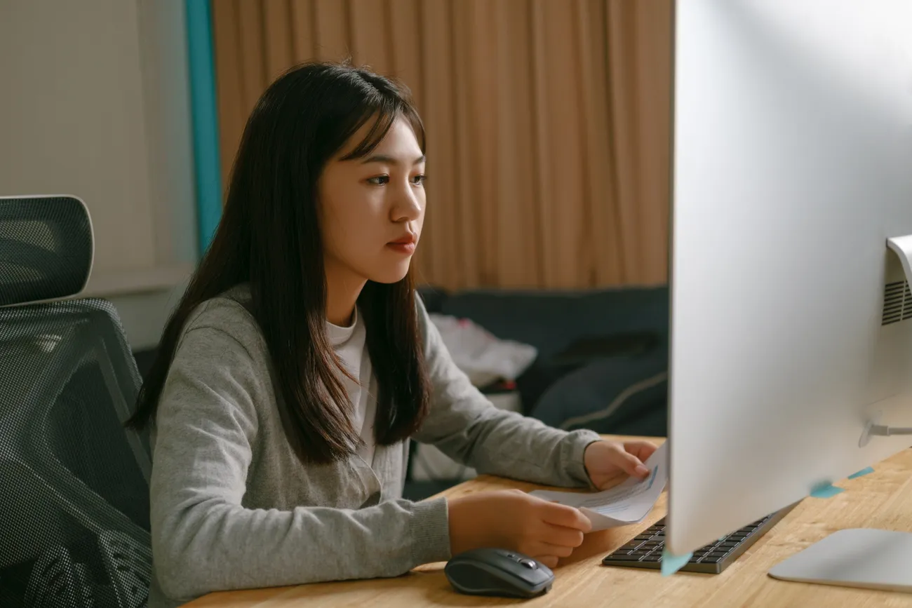a woman sitting at a desk with a computer
