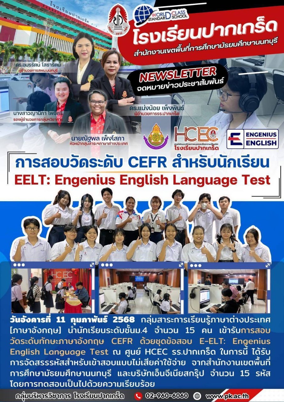 เมื่อวันอังคารที่ 11 กุมภาพันธ์ 2568 กลุ่มสาระการเรียนรู้ภาษาต่างประเทศ [ภาษาอังกฤษ] น่านักเรียนระดับชั้นม.4 จํานวน 15 คน เข้ารับการสอบ วัดระดับทักษะภาษาอังกฤษ CEFR ด้วยชุดข้อสอบ E-ELT: Engenius English Language Test ณ ศูนย์ HCEC โรงเรียนปากเกร็ด ในการนี้ ได้รับ การจัดสรรรหัสสําหรับเข้าสอบแบบไม่เสียค่าใช้จ่าย จากสํานักงานเขตพื้นที่ การศึกษามัธยมศึกษานนทบุรี และบริษัทเอ็นจีเนียสกรุ๊ป จํานวน 15 รหัส โดยการทดสอบเป็นไปด้วยความเรียบร้อย