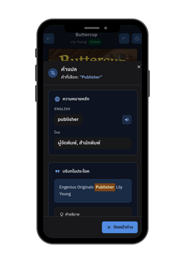 แตะค้างที่ คำศัพท์หรือประโยค ภายในหน้าอ่าน